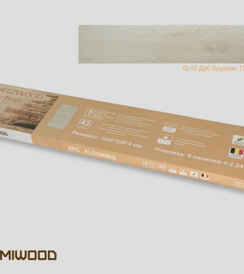 Кварц виниловый ламинат Q-12 Дуб Бруклин — это замковый SPC ламинат толщиной 5 мм, который подходит как для пола, так и для стен. Материал полностью водостойкий и включает встроенную подложку. Коллекция QUARTZWOOD предлагает экономичный, но качественный кварц виниловый ламинат, изготовленный из SPC и имеющий класс износостойкости 43. Защитный слой толщиной 0,5 мм обеспечивает долговечность. Ламинат Lamiwood имеет замковое соединение и микро V-фаску, что делает его подходящим для использования как в жилых, так и в коммерческих помещениях. В одной упаковке содержится 8 панелей, общей площадью 2,24 м².