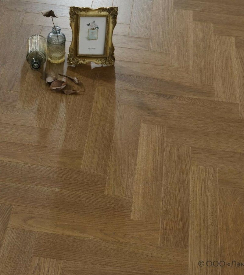 Ламинат не требует финишной отделки. Его верхний слой с рисунком «Елочка» гармонично вписывается в любой интерьер и хорошо сочетается с любыми настенными и потолочными покрытиями. Толщина доски составляет 12 мм, что обеспечивает прочность и устойчивость к прогибу. Ламинат выдерживает большой вес мебели и не оставляет следов от ножек и царапин. Он хорошо сохраняет тепло в помещении и не пропускает холод.