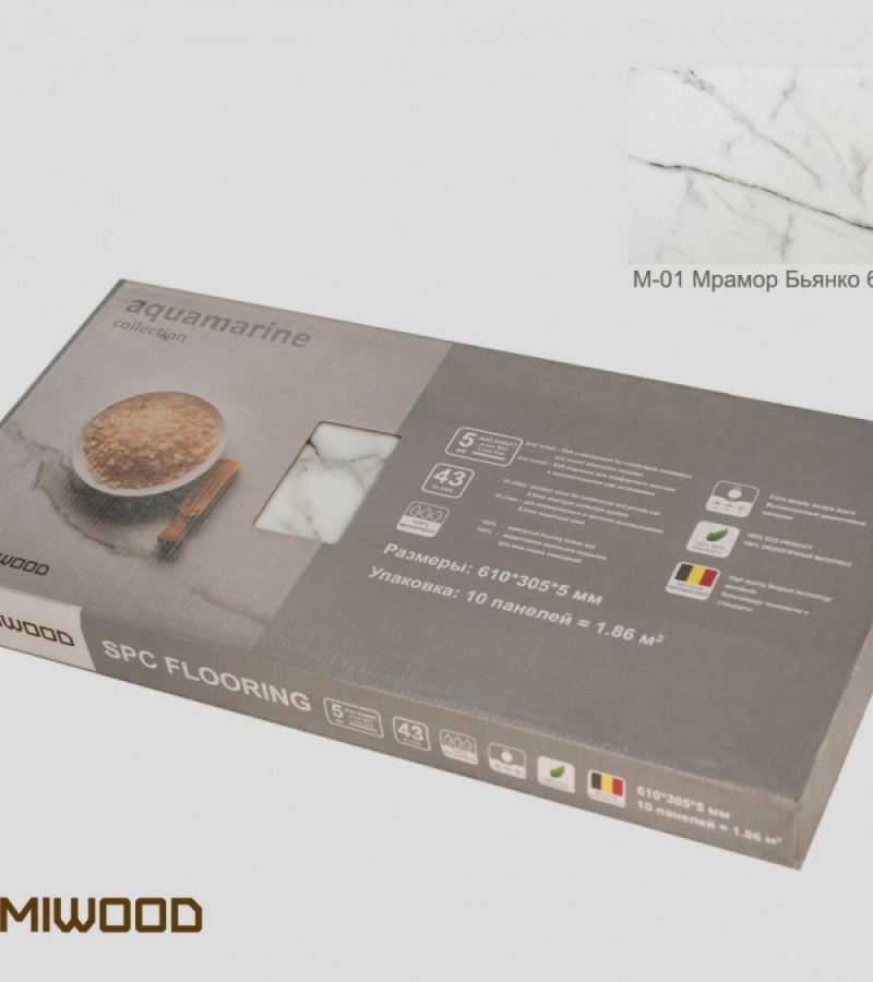 Ламинат М-01 Мрамор Бьянко из коллекции AQUAMARINE — это отличное решение для тех, кто ищет качественное и прочное покрытие для пола. Этот материал изготовлен из инновационного материала SPC, который обеспечивает ему высокую износостойкость и долговечность.